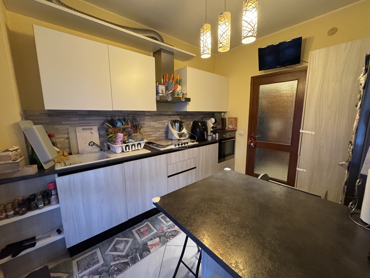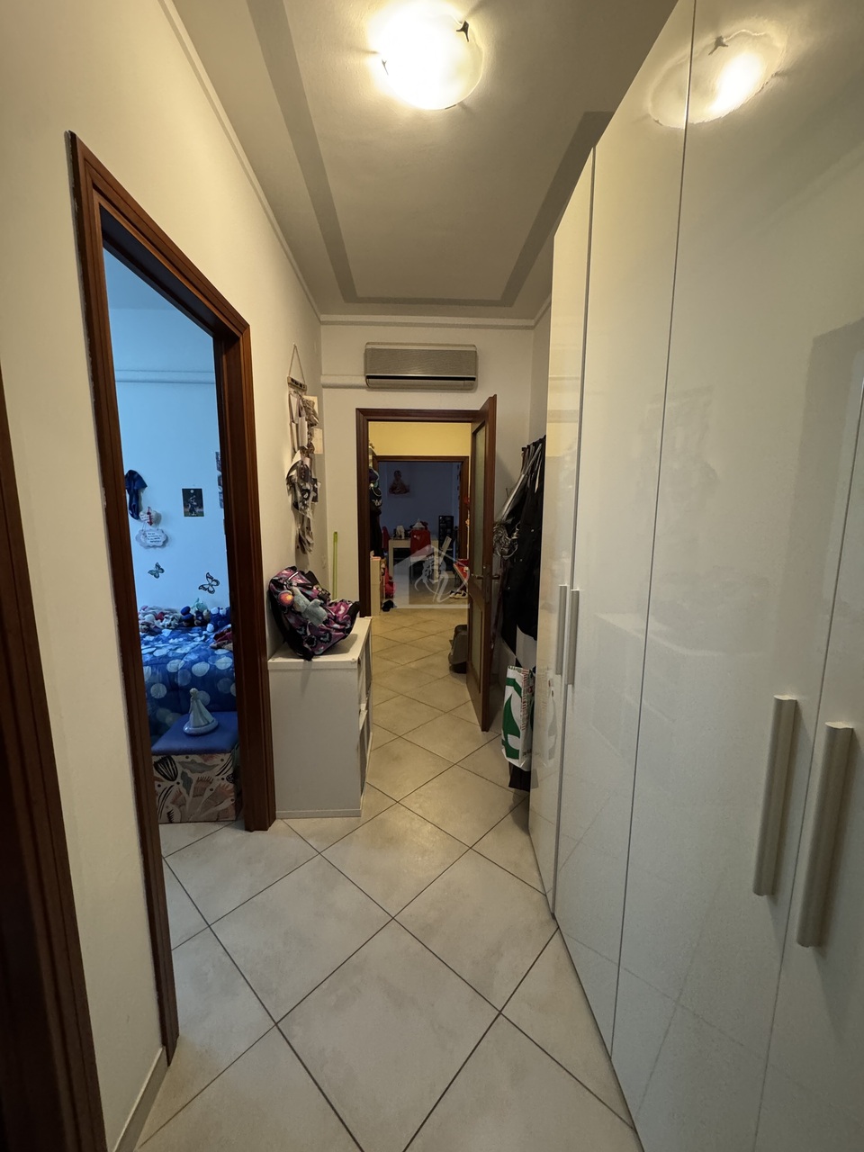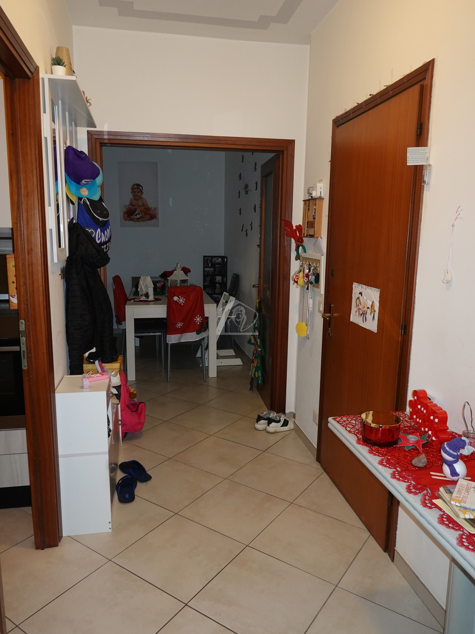 ingresso, soggiorno, cucina abitabile, balcone, disimpegno, 1 camera da letto trequarti, 1 camera da letto matrimoniale, bagno, cantina e garage.