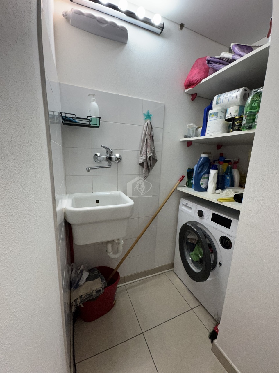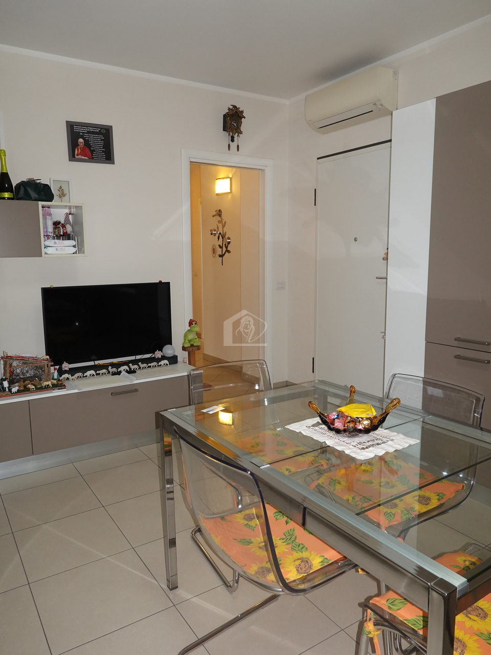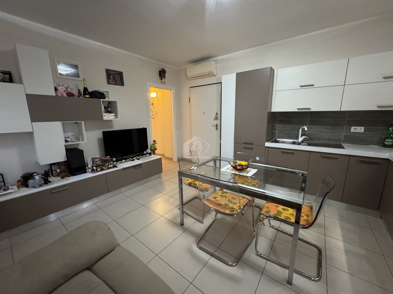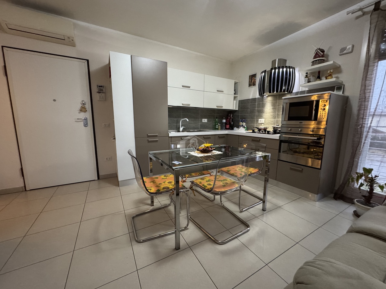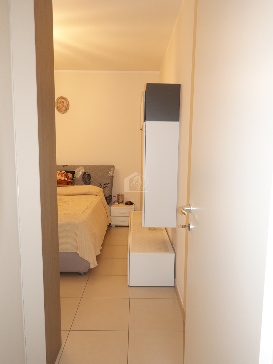 soggiorno con angolo cottura, disimpegno zona notte, 1 camera da letto singola, ripostiglio/lavanderia, bagno con doccia, 1 camera da letto matrimoniale, balcone, garage con ingresso diretto alla palazzina e 1 posto auto scoperto.