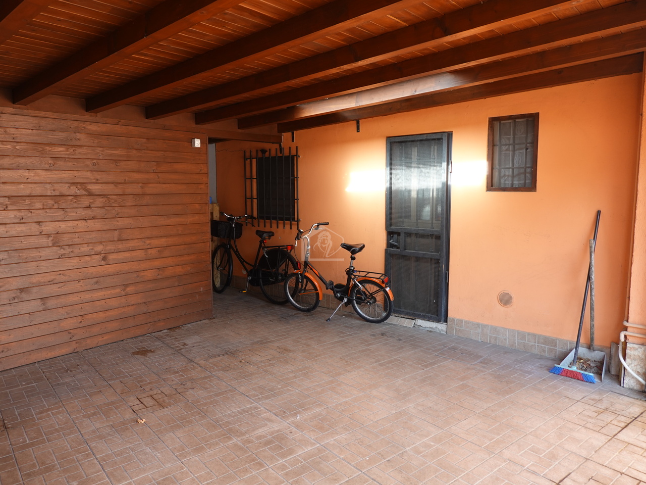 Tettoia in legno per due posti auto coperti, ripostiglio e giardino recintato e piantumato con doppio ingresso carrabile.