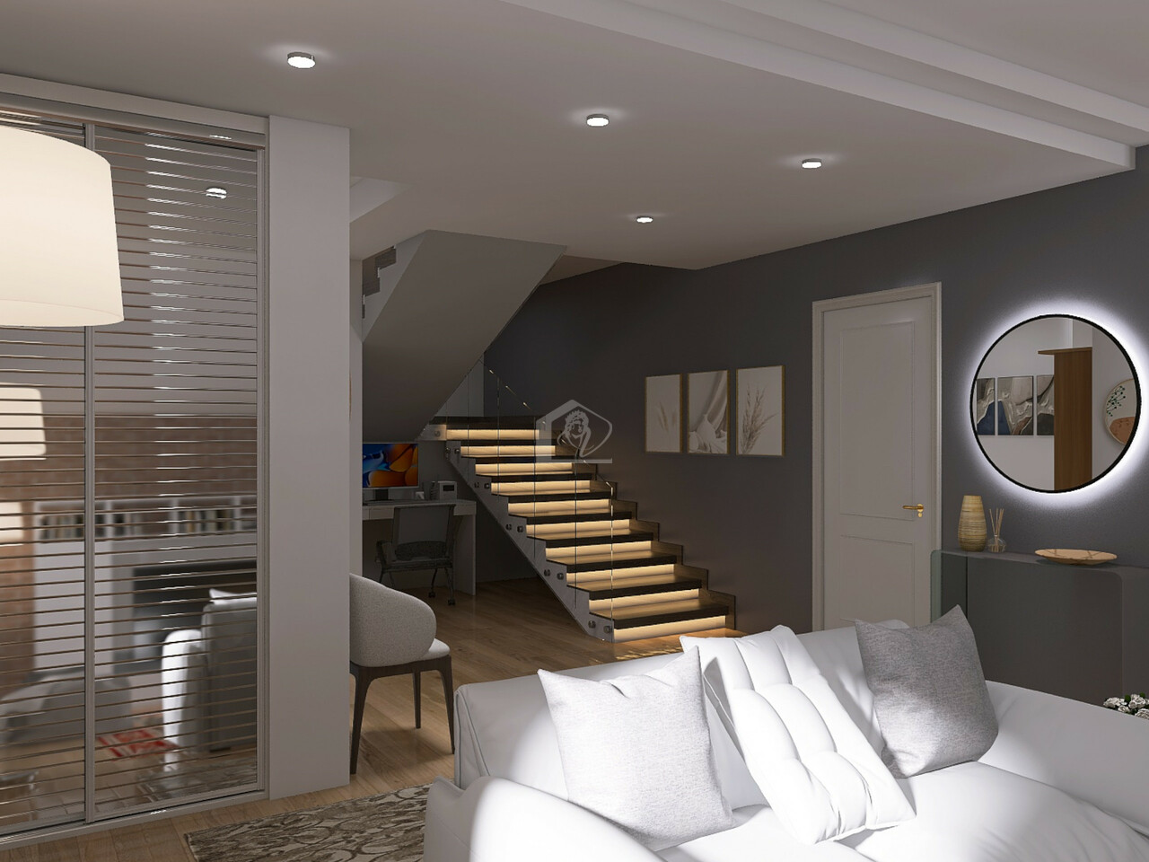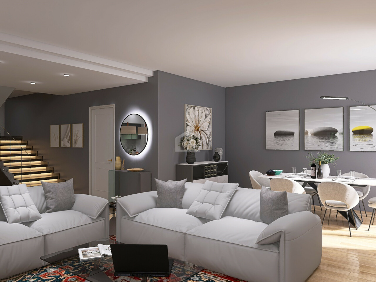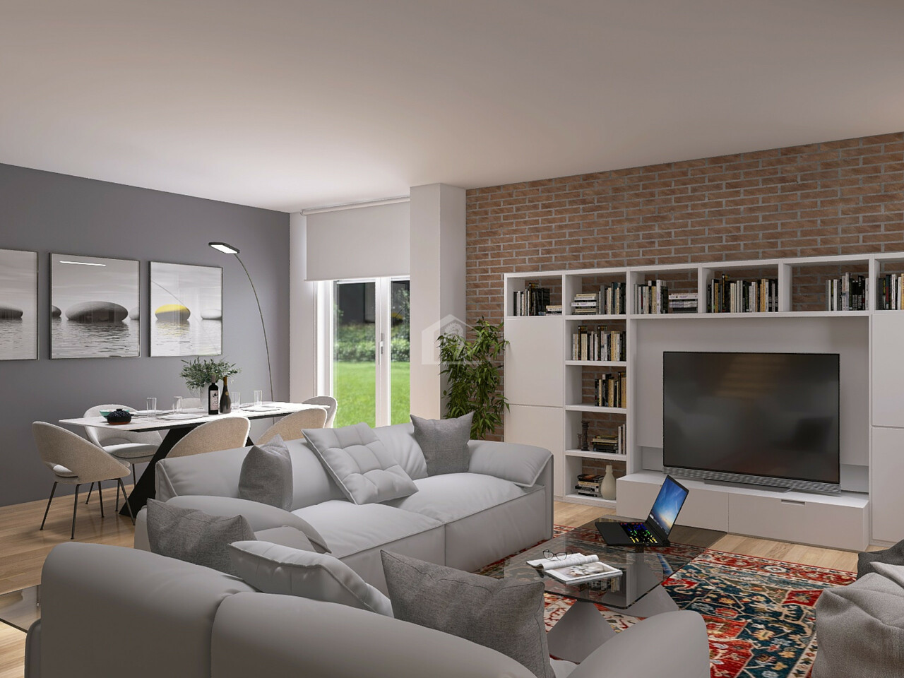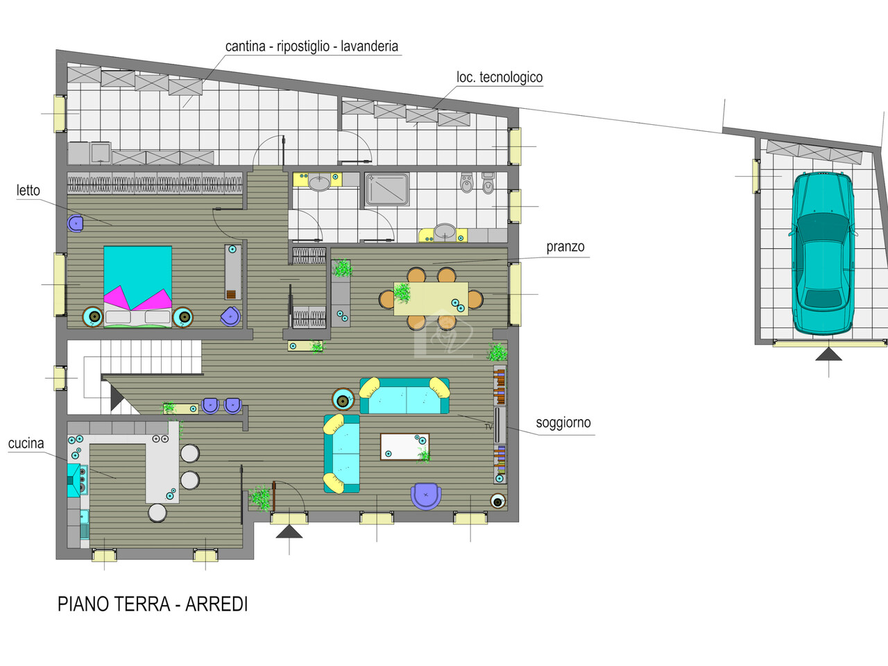 al piano terra da ingresso in ampio e luminoso soggiorno con zona pranzo, cucina abitabile, disimpegno, ripostiglio, 1 camera da letto matrimoniale, bagno con antibagno, ripostiglio/lavanderia, locale tecnico e vano scala;