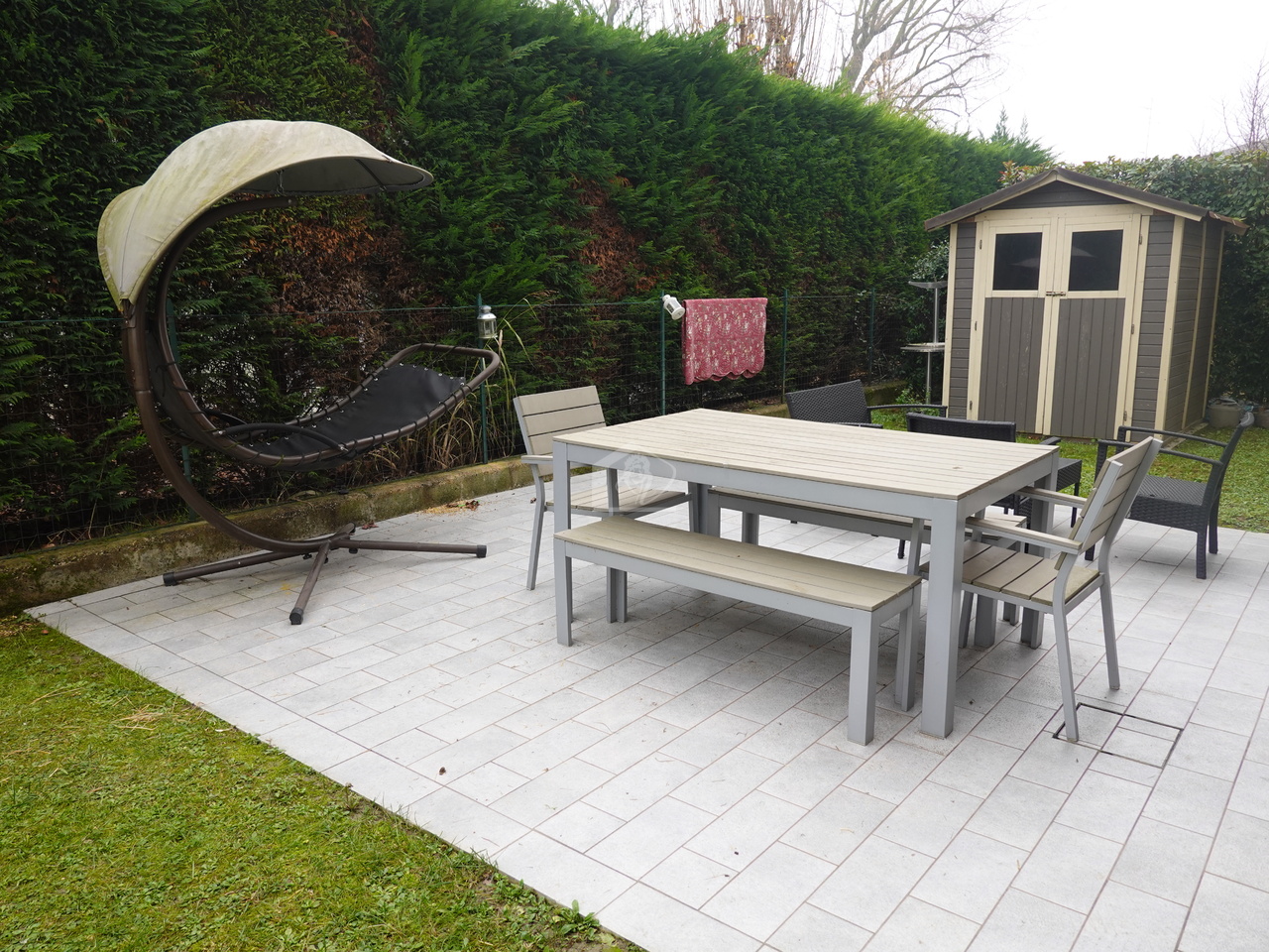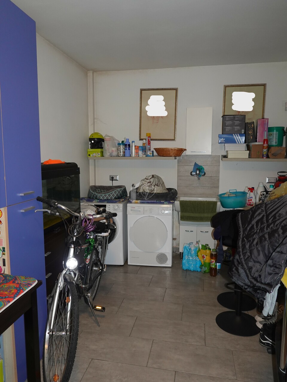 ingresso in ampio soggiorno con cucina in open space con affaccio su zona living esterna sul retro, disimpegno, bagno con doccia e garage con angolo lavanderia;